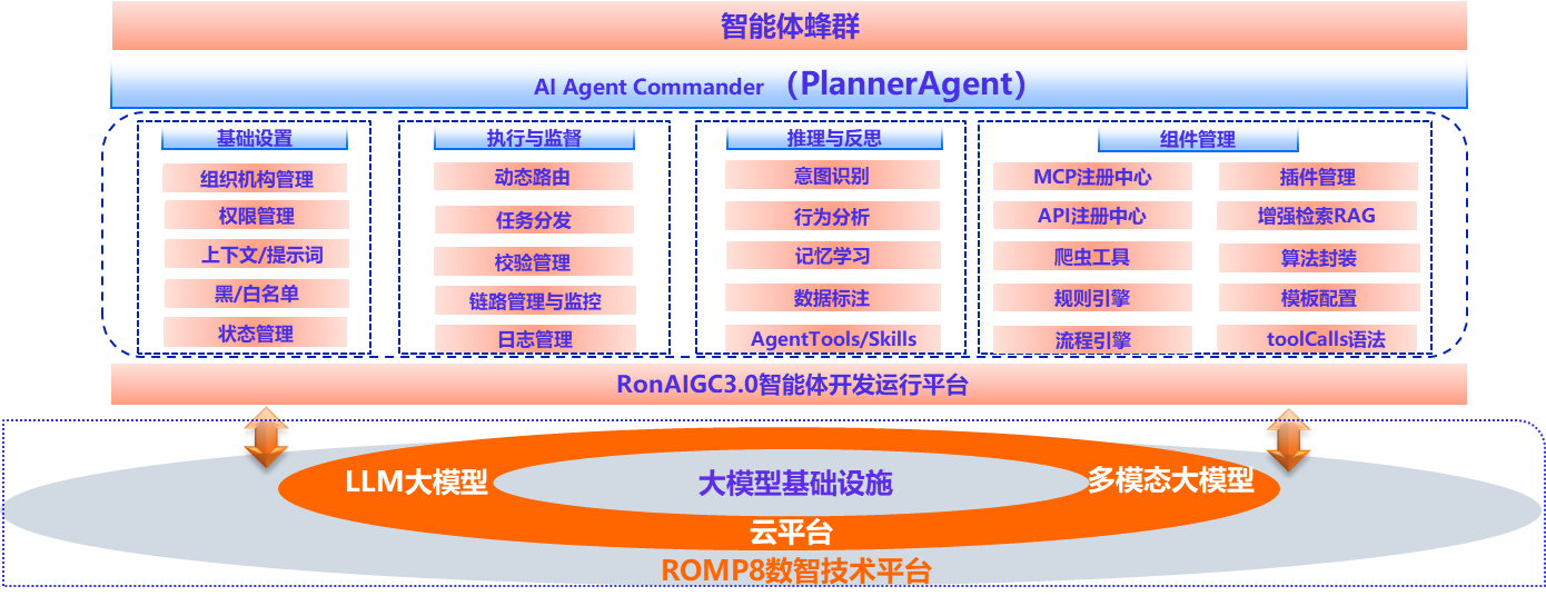 企业级智能体通用开发平台(RonAIGC)是一个企业级智能体全生命周期的、集成化的、快速的开发平台。平台以ROMP8数智化技术平台为底座,以DeepSeek、通义千问等大语言模型为基础AI模型支撑,通过预处理系统保障数据安全与企业权限管理,并依托多智能体协同引擎驱动企业管理软件、企业知识库与专业智能体高效协同运转,整体实现企业级智能体从构建、感知、调度、规划、执行、决策到优化改进的全过程开发与管理,助力企业软件一步升级为企业管理智能体,推动企业管理从“数字化”迈向“数智化”的史诗级跨越。