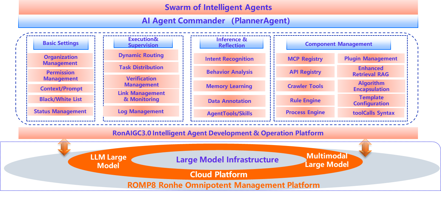 The core mission of the RonAIGC platform is to empower enterprises in building L4-level (autonomous collaboration) intelligent agents with complete cognitive and action cycles. This represents not only an upgrade from traditional automation tools or basic Q&A robots, but also a pivotal engine driving the transformation of enterprise management paradigms from "digitalization" to "digital intelligence." Through RonAIGC, organizations can seamlessly integrate fragmented software systems, static knowledge assets, and specialized business capabilities into an intelligent entity capable of autonomous perception, proactive planning, collaborative execution, continuous learning, and optimization. These L4-level agents evolve from passive command responders into "digital employees" or "intelligent collaborators" within enterprises. They can comprehend complex business contexts, decompose and schedule cross-system tasks, ultimately driving fundamental leaps in operational efficiency, decision-making quality, and innovation capabilities.