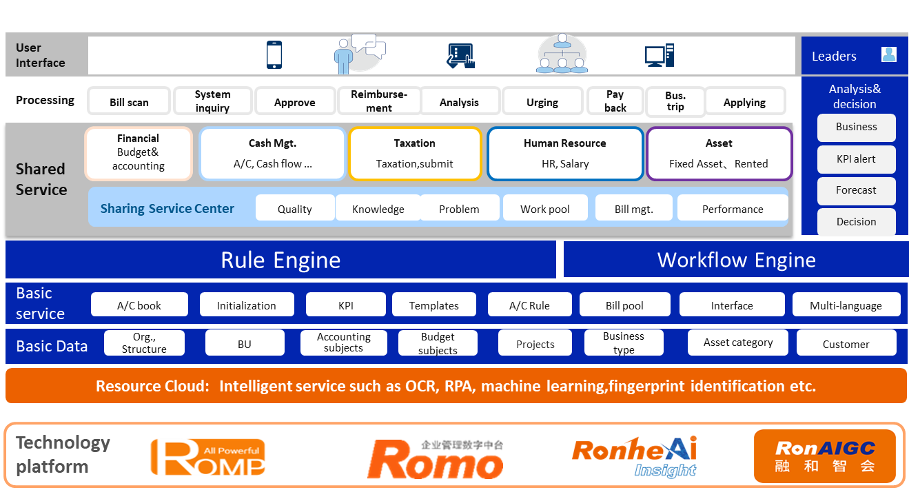 The Intelligent Financial Management System utilizes a "1+2+5+1" architecture, which includes 1 low-code development platform, 2 driving engines (rule engine and workflow engine), 5 shared services (financial shared services, settlement shared services, tax shared services, human resource shared services and procurement shared services), and a shared center operation platform.