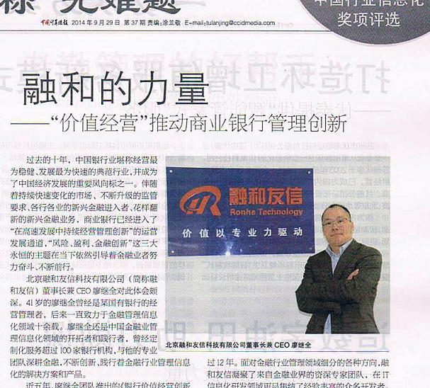 融和友信荣膺2014年度中国金融信息化最佳解决方案奖2014年9月19日,第六届中国行业信息化奖项评选结果揭晓,北京融和友信科技有限公司(以下简称融和友信)凭借其自主研发的“金融企业价值经营管理解决方案(VBM 6.0)”,荣膺“2014年度中国金融信息化最佳解决方案...了解更多2014-09-20 -