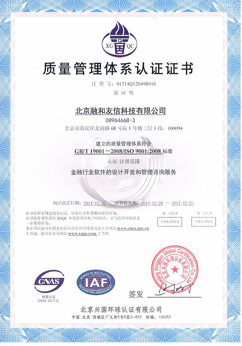 2015-01-22融和友信通过ISO9001:2008质量管理体系认证2014年年末,经过国家权威认证机构连续几个月的严格的培训、考核和审核,北京融和友信科技有限公司(以下简称“融和友信”)通过GB/T19001-2008/ISO9001:2008质量管理体系认证,并获颁认证证书,这是融和友信在“金...了解更多 -