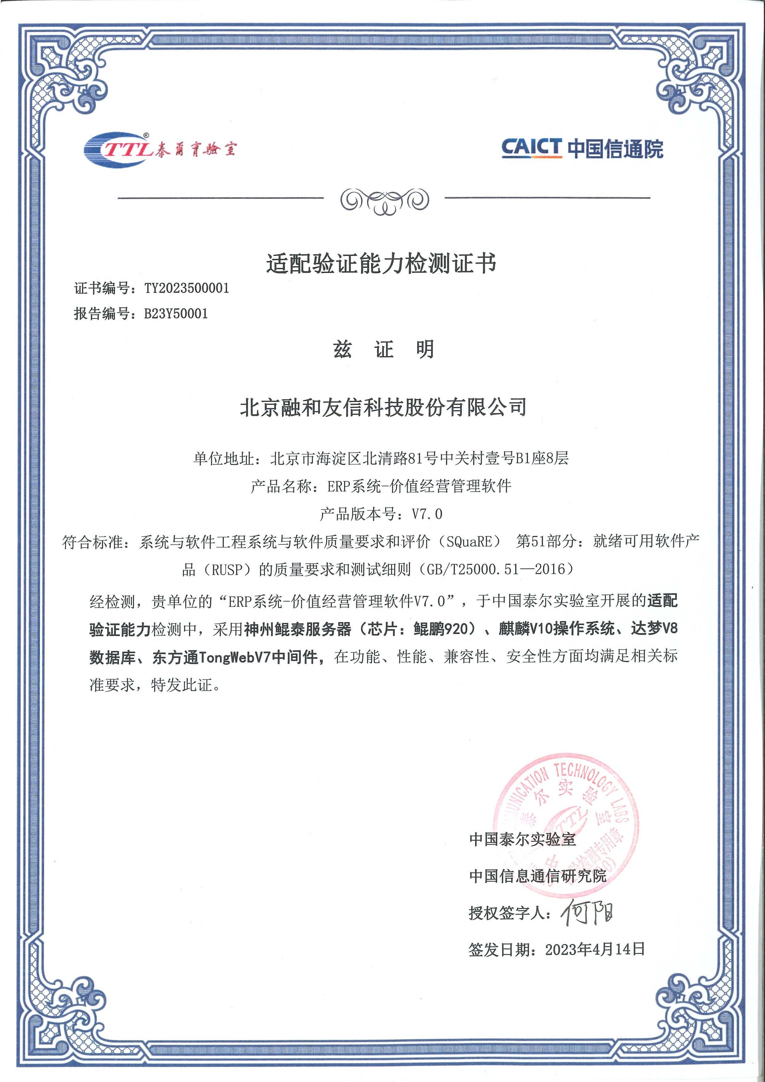 2023-04-20融和科技“超级ERP系统”通过国家权威机构的国产信创认证与超级性能测试2023年4月14日,北京融和友信科技股份有限公司(简称“融和科技”)的“ERP系统-价值经营管理软件V7.0” 通过国家权威机构-中国信息通信研究院(简称“中国信通院”)国产信创适配验证能力(功能、性能、兼容性、安全...了解更多 -