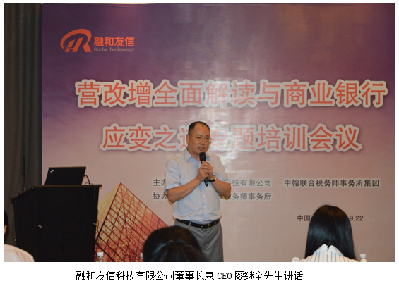 2015-09-23融和友信再次成功举办银行业“营改增”培训2015年9月22日,由北京融和友信科技有限公司(简称“融和友信”)、中翰联合税务师事务所集团主办、四川中翰大壮税务师事务所协办的《营改增全面解读与商业银行应变之道》专题培训在美丽的成都超五星级环球中心天堂洲...了解更多 -
