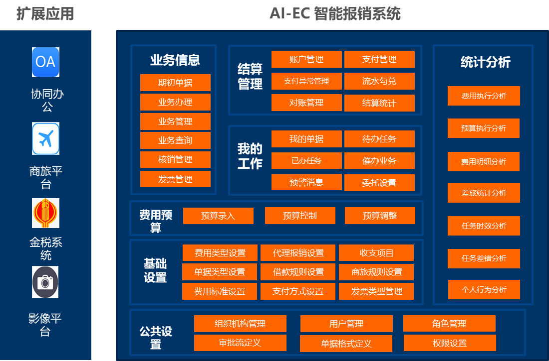 7、风险管控能力:实现资金风险监控、发票风险管控、报销事项管控、超标风险及时预警、业务道德风险预警等。