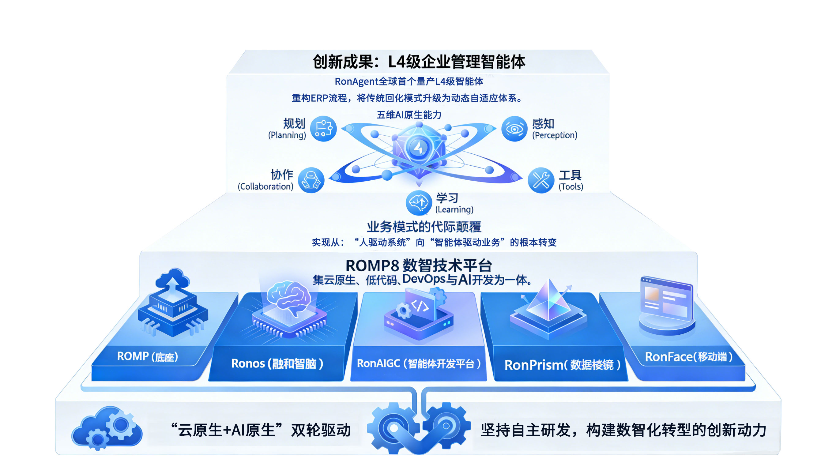 基于数智技术平台ROMP8,融和科技定义并量产了全球首个L4级企业管理智能体——RonAgent。RonAgent具备“规划、感知、协作、工具、学习”五维AI原生能力,通过“意图即生成”的逻辑,将传统ERP固化流程重构为动态自适应的智主协作体系,实现了从“人驱动系统”向“智能体驱动业务”的代际颠覆。这标志着公司已从传统软件公司成功蝶变为AI原生技术产品公司,引领企业管理从数字化迈向“智主管理”的智能化新纪元。