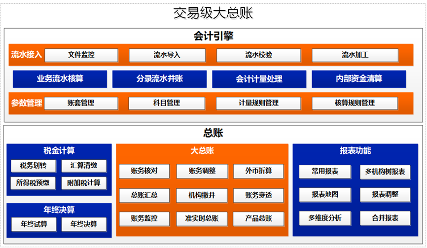 交易级大总账系统分为两个主要模块:会计引擎模块和总账模块。