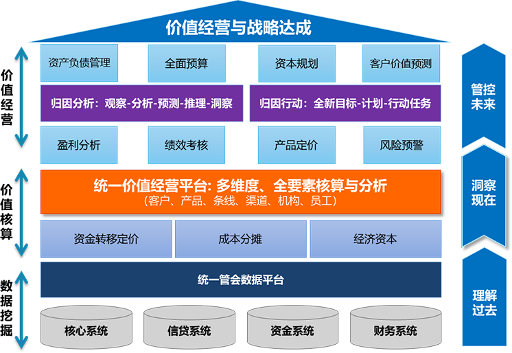 企业内部各经营主体通过管理会计工具(资金转移定价、成本分摊、经济资本)精细化核算其在一定周期内经营结果,通过归因分析与方法,理解结果产生的原因,深刻解释其经营行为,并围绕原因进行静态与动态的分析、测算、推理和洞察,进而产生新的经营目标、以及匹配新的经营计划;由此传导至企业经营者,实时理解过去、洞察现在、管控未来,实现主动分析、调整策略并采取相应行动,确保组织经营目标的达成。