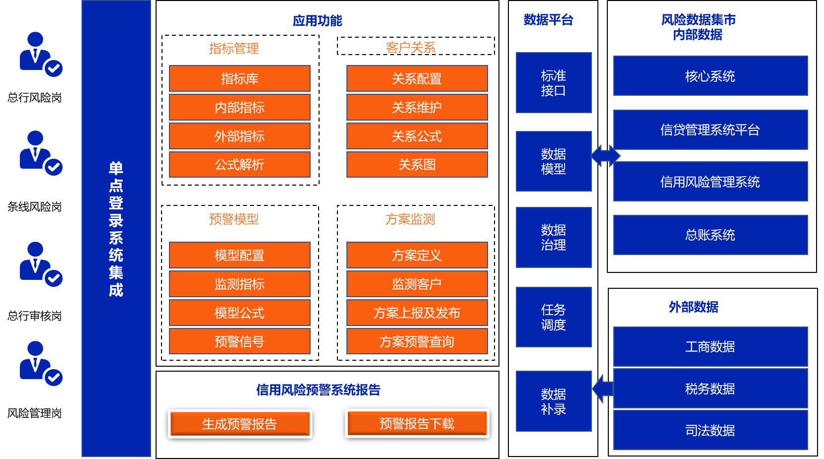 建立基于行内数据和外部大数据的风险预警模型和规则体系,实现对各类信贷客户的风险预警。