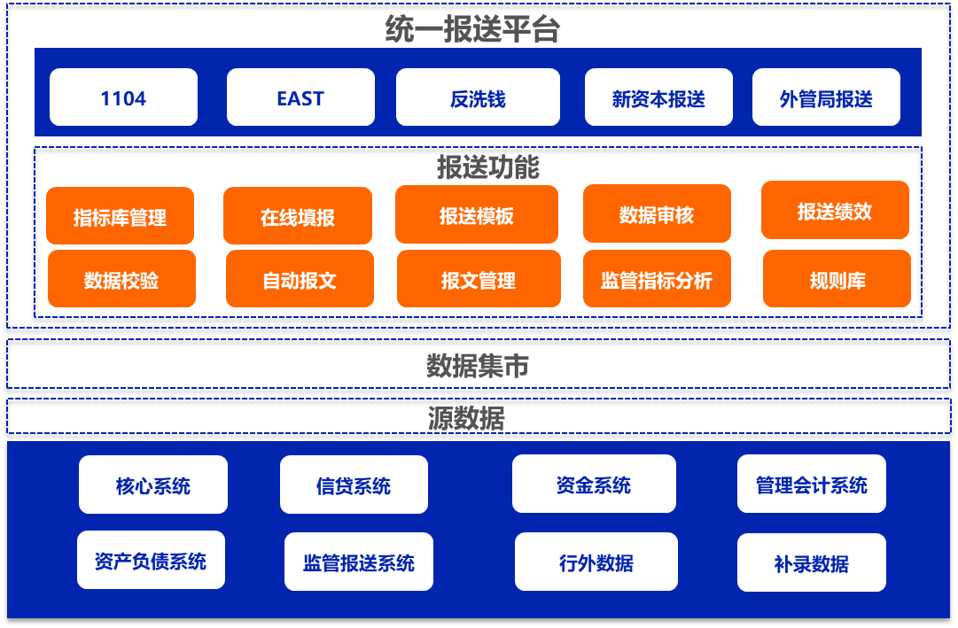 采用统一报送平台,满足三大监管当局报送要求,采用专项的报送集市,做到报送数据准确、及时、统一。采用规则库、指标库管理、在线填报、自动报文、数据审核等功能,使报送更加简单。