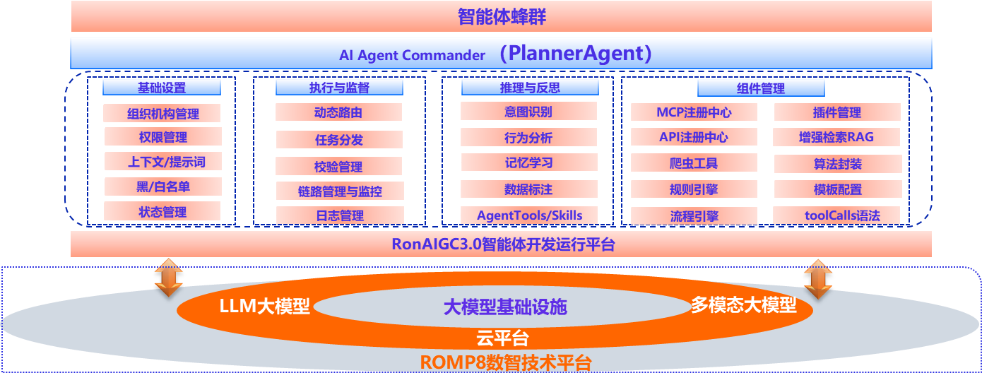 RonAIGC企业级智能体通用开发平台是实现企业从“辅助人力”向“自主执行”飞跃的核心引擎。平台通过将大模型的认知能力与企业业务流程深度结合,让智能体从传统被动响应的“聊天机器人”进化为具备主动规划能力的“数字员工”。