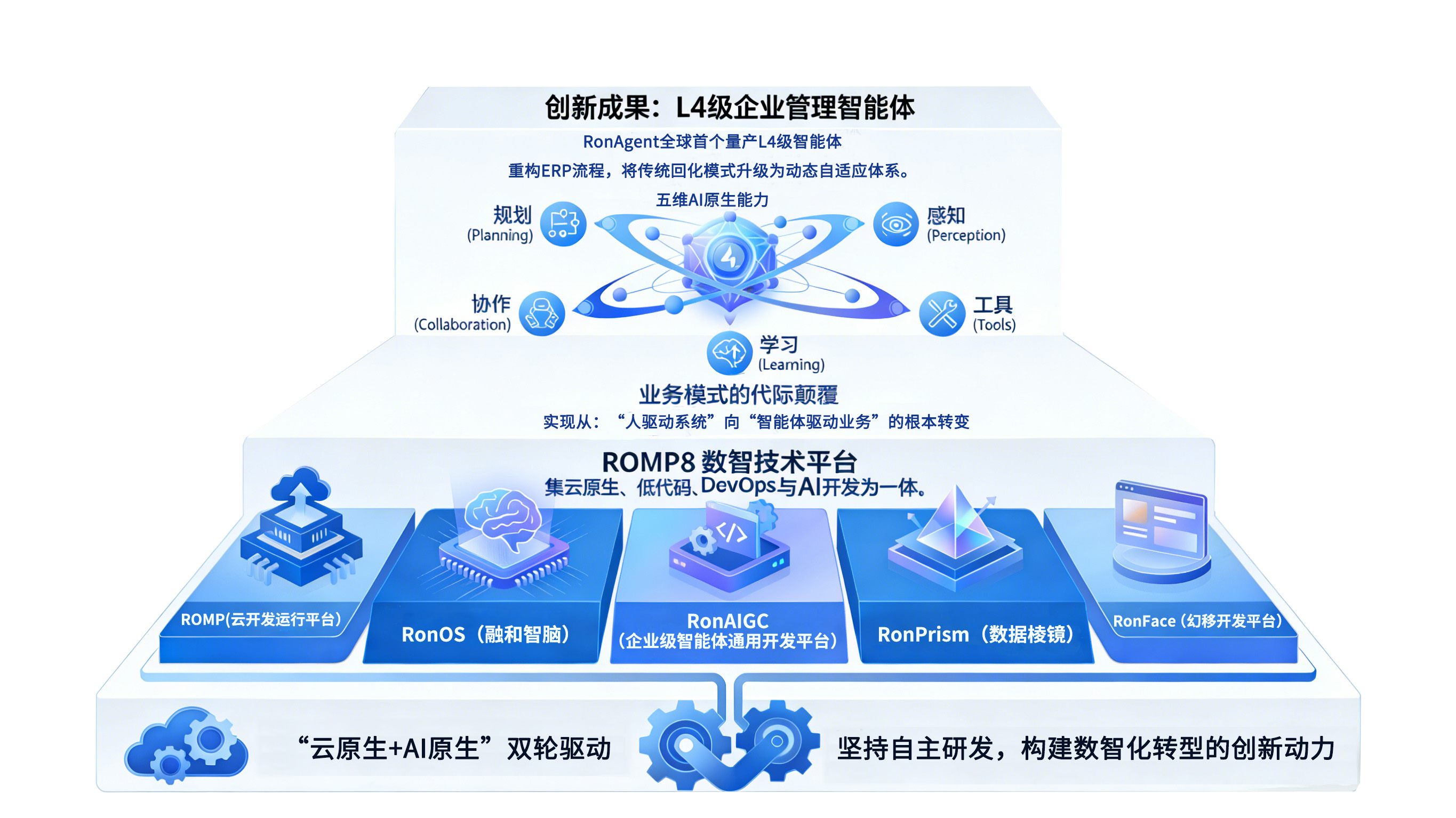 基于数智技术平台ROMP8,融和科技定义并量产了全球首个L4级企业管理智能体——RonAgent。RonAgent具备“规划、感知、协作、工具、学习”五维AI原生能力,通过“意图即生成”的逻辑,将传统ERP固化流程重构为动态自适应的智主协作体系,实现了从“人驱动系统”向“智能体驱动业务”的代际颠覆。这标志着公司已从传统软件公司成功蝶变为AI原生技术产品公司,引领企业管理从数字化迈向“智主管理”的智能化新纪元。